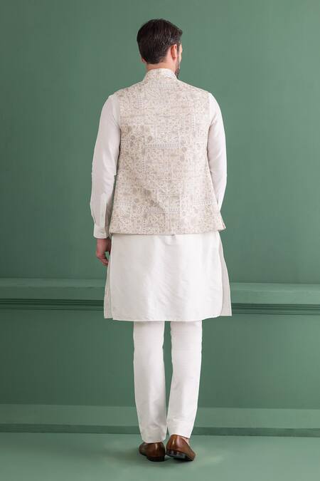 White silk bundi featuring floral mandala embroidery. Paired with an inner kurta and matching aligadhi pant, both made of cotton silk.