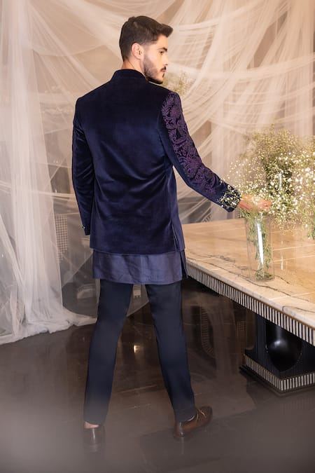 Navy blue jacket featuring thread and bead hand embroidery in floral pattern. Paired with an embroidered placket kurta and pant.