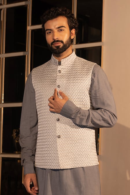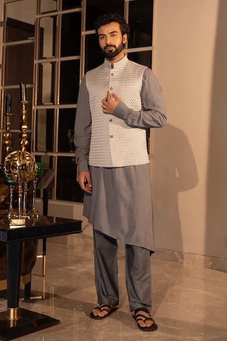 Grey waistcoat featuring floral hand embroidery. Paired with an asymmetric kurta and aligarhi pants.