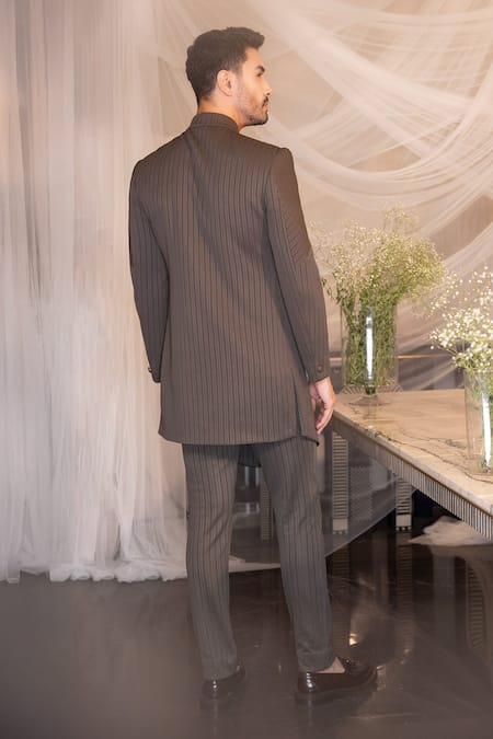 Olive green jacket featuring brooch embellishment and herringbone detailing. Paired with coordinating polywool pant.