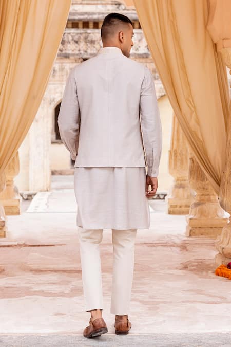 Grey bundi featuring all-over Kashmiri ambrosia embroidery. Paired with a solid kurta and Aligadhi pant.
