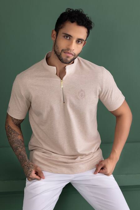 Beige half sleeve t-shirt featuring a collared neckline and zipper detail