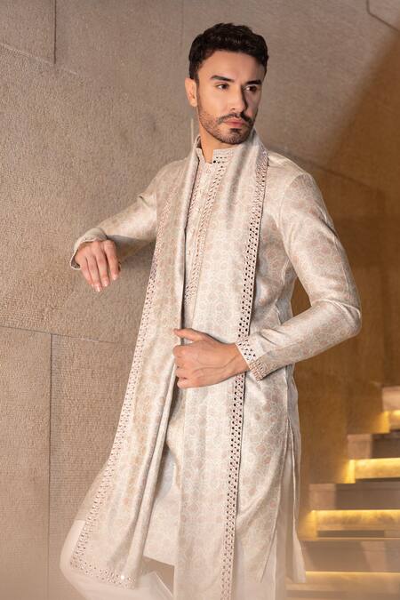 Mint green kurta featuring mirror embroidery and floral print. Paired with a matching aligadhi and an embroidered stole.