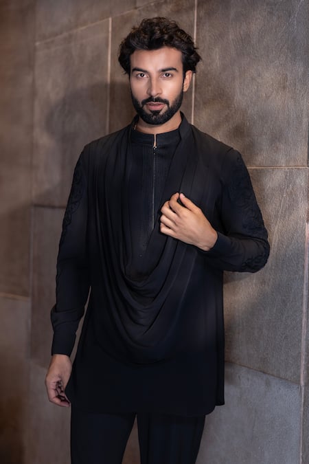 Black kurta featuring thread embroidered sleeves with an attached cowl style drape. Paired with a coordinating solid aligadhi.
