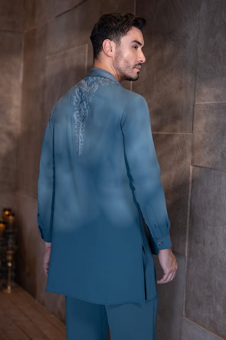 Blue Polyester Embroidery Thread Drape Kurta With Aligadhi