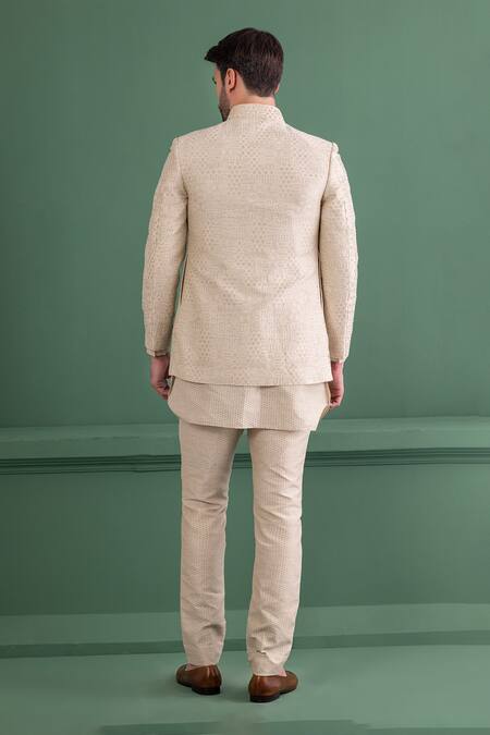 Beige jacket featuring geometric thread embroidery and a mandarin collar. Paired with a geometric woven kurta and pant.