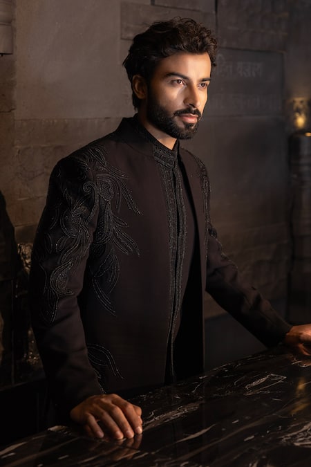 Black jacket featuring intricate bead and thread hand embroidery. Paired with a matching short kurta and pant for a complete look.