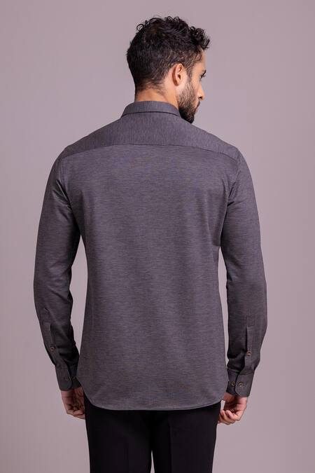 Grey shirt featuring a woven striped pattern with placed patch detail and side flap pockets