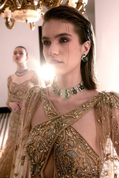 Intricate crystal tassel embroidery, Zardozi and bead embellishments, Flowing cape with detailed embroidery