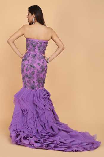 Purple bandeau gown with fish-cut silhouette, floral motif bead work, cascading ruffles & trail detail.
