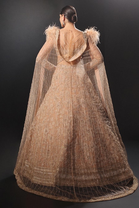 Gold tulle lehenga featuring all-over floral jaal pattern with tonal threads, sequin, bead & cut dana hand embroidery. Paired with an illusion boat neck padded blouse with embroidered hooded back fall drape and feather tassel details.