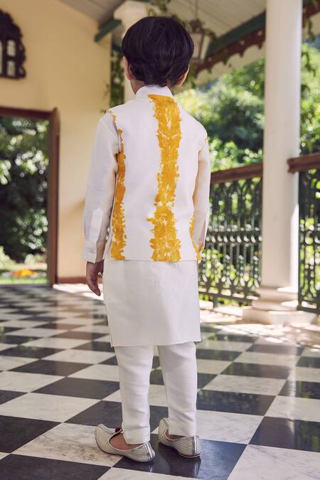 White kurta set featuring eco printed floral motifs and a mandarin collar. Paired with a sleeveless bundi and cotton twill trousers.