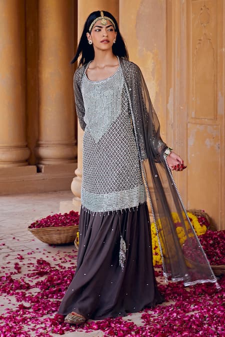 Mud green kurta featuring bead, sequin, and crystal embellishments in a floral pattern. Paired with a gathered skirt and an ombre dupatta with border embellishments.