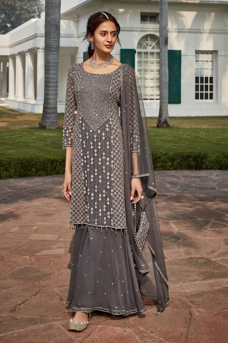 Charcoal gray tunic featuring all-over crystal, sequins, and mirror embellishments. Paired with a sharara adorned with sequin tikki embellishments and a matching dupatta.