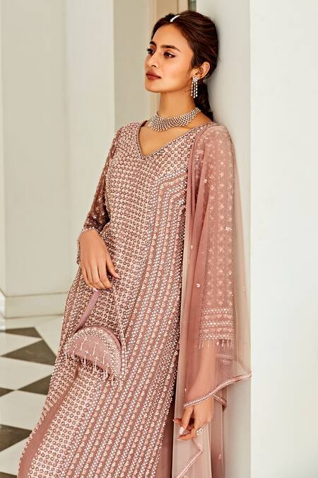 Pink tunic featuring V neckline and three quarter sleeves with all-over crystal and sequins embroidery. Paired with a coordinating sharara and ombre dupatta.