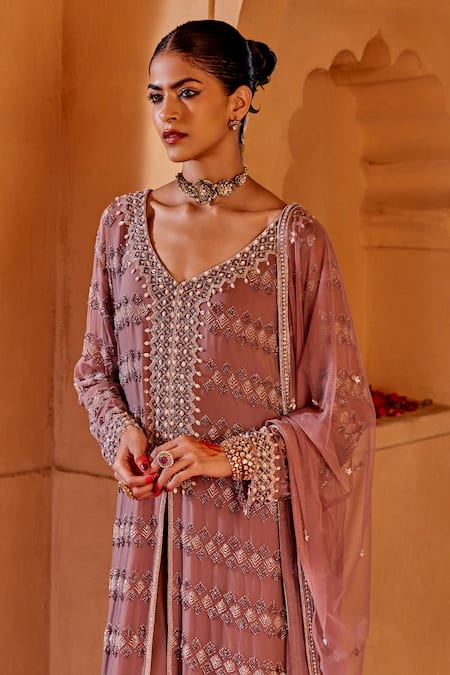 Purple kurta featuring V neck, full sleeves, and intricate cut dana embroidery. Paired with a flared sharara and a soft net dupatta adorned with embellishments.