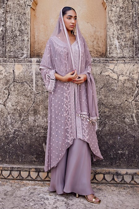 Purple embellished kurta featuring a leaf neck, bell sleeves, and a front slit. Paired with a gathered skirt and a border embellished sheer dupatta.