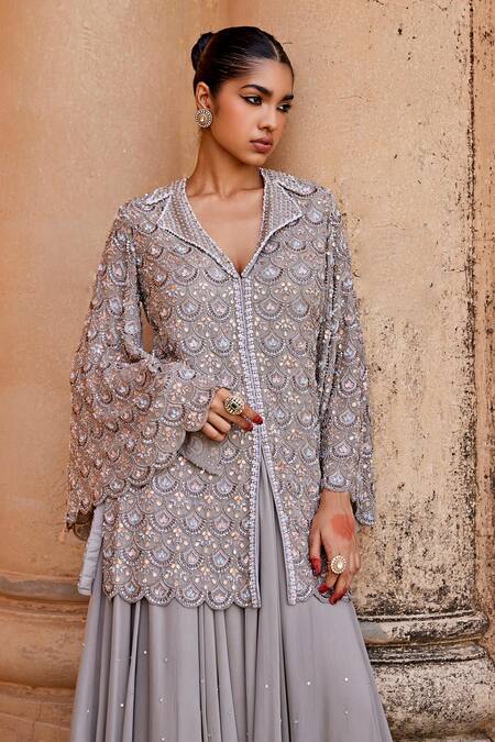 Grey jacket featuring a notched collar, embroidered scalloped pattern, and a front high slit. Paired with embroidered flared bottom pants.