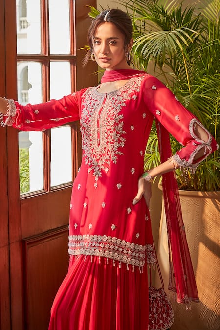 Fuchsia pink tunic featuring floral bloom embroidery with crystal, sequins, and cutdana. Paired with a gathered sharara and dupatta with embroidered borders.
