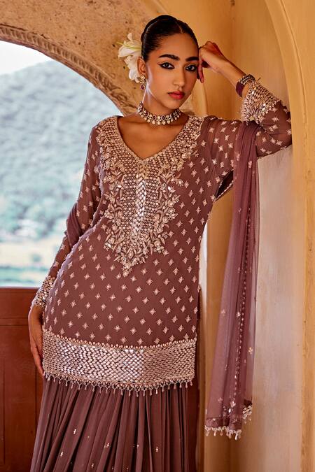 Purple Georgette Embroidered And Embellished Sequin V Neck Floral Kurta Skirt Set