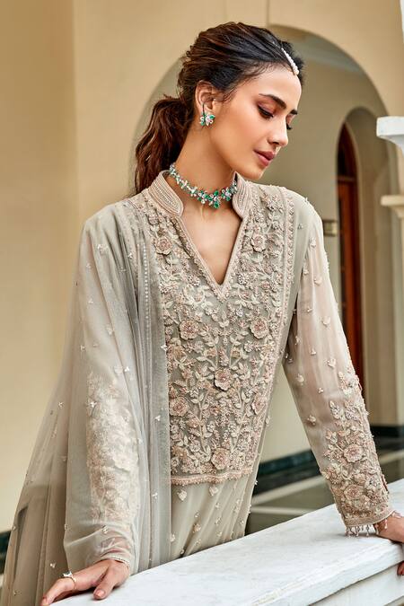 Light grey tunic featuring floral embroidered yoke with sequins, crystals, beads, and all-over butti work. Paired with a sharara and butti embroidered dupatta.