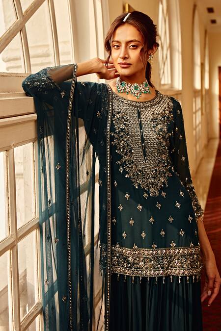 Arabian green tunic featuring floral and resham embroidery. Paired with a gathered sharara and net dupatta adorned with crystal tassels.