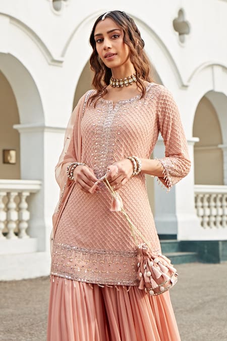 Peach tunic featuring round neck, three quarter sleeves, and tasseled cuffs. Paired with a pleated sharara and dupatta with embroidered border.