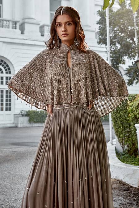 Grey cape featuring all-over sequin and bead embroidery with a collared neck. Paired with a matching sharara and inner bustier.