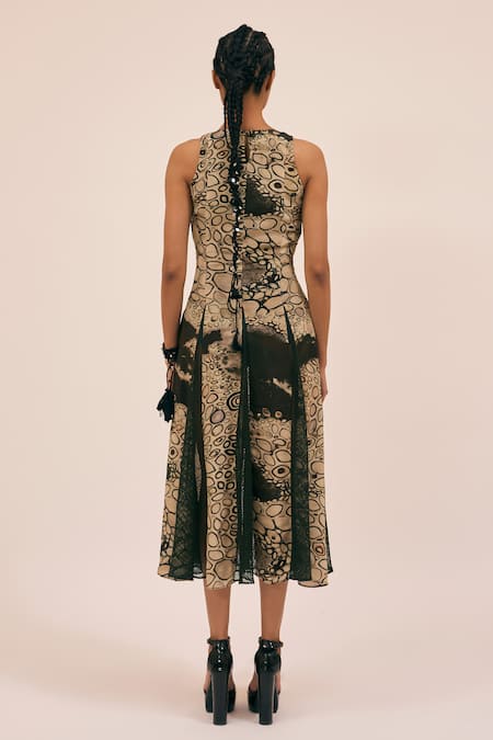 Beige Silk Beads, Sequins Square Boneset Abstract Print Embroidered Midi Dress