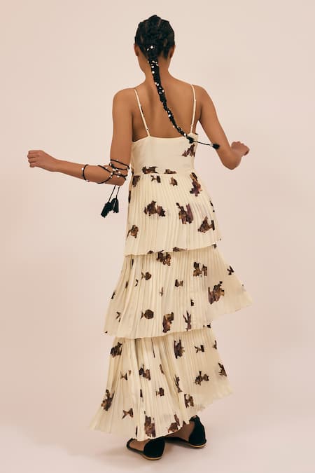 Pleat details enhancing the tiered structure, Spaghetti straps for a delicate look
