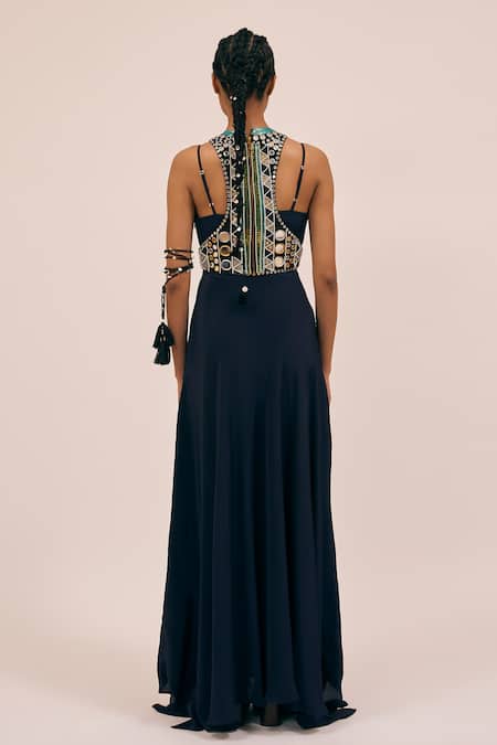 Seaweed green maxi dress featuring a halter neckline and sleeveless design in natural silk. Paired with a mirror, sequin, and bead embroidered cutout jacket with a back zip.