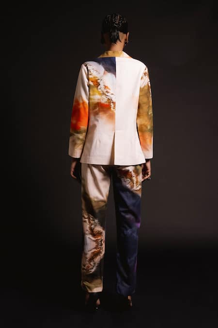 Peach and blue blazer featuring a lapel collar and full sleeves with an all-over galactic bloom print. Paired with matching print pants for a cohesive look.