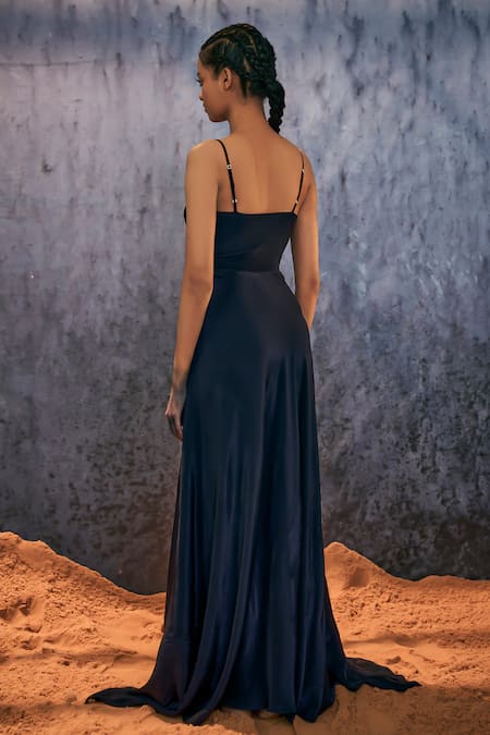 Midnight blue maxi dress featuring spaghetti straps and a sweetheart neckline in natural silk