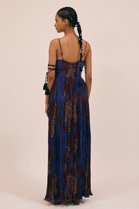 Blue Silk Beads Sweetheart Neck May Mosaic Splatter Print Pleated Maxi Dress