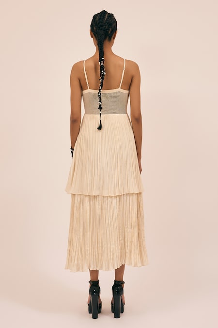 Ivory pleated tiered midi dress featuring a sweetheart neckline and sleeveless design