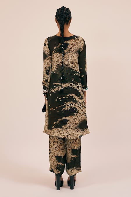 Beige Silk Beads, Mirrors Yucca Ripple Gaze Print Front Slit Kurta With Palazzo