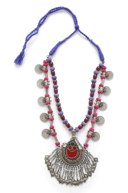 Antique silver tone boho pendant necklace featuring tribal coin embellishments and thread balls