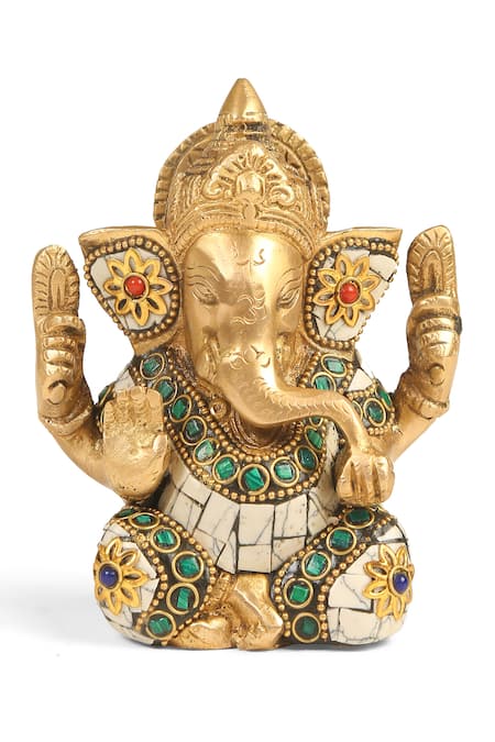 Antique gold brass idol with Ganesha carved motifs & white, multicolor stone embellishment.