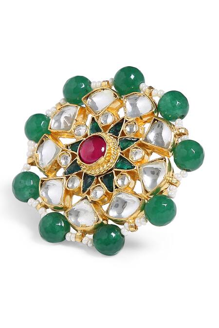 Gold tone floral cutwork ring featuring kundan and green beaded highlights