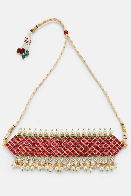 Gold tone geometric patterned kundan choker necklace featuring stones and synthetic pearls