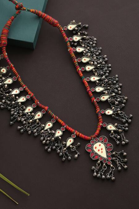 Silver tone vintage effect tear drop pendant necklace featuring glass embellishments and ghungaroo highlights