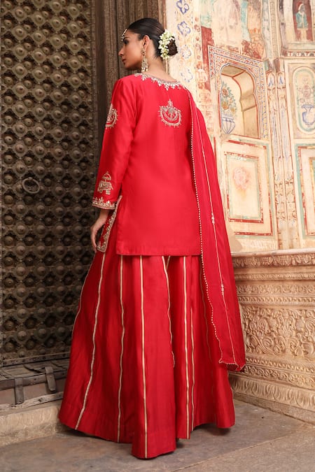 A red silk kurta features intricate marodi work embroidery and a V-neckline. It is paired with a matching red sharara and a red dupatta.