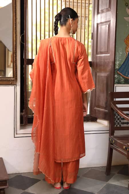 A rust silk chanderi kurta featuring intricate hand embroidery and a V-neckline. It is paired with coordinating rust silk chanderi pants and a matching dupatta with scalloped edges.