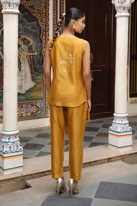 A mustard yellow silk chanderi top featuring a sleeveless design, V-neckline, and an overlap front with intricate hand embroidery along the edges. It is paired with coordinating mustard yellow silk chanderi pants.