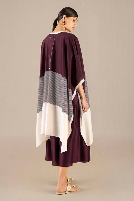 Purple chanderi flared asymmetric cape featuring woven stripe patterns. Comes with an inner jumpsuit and a belt.