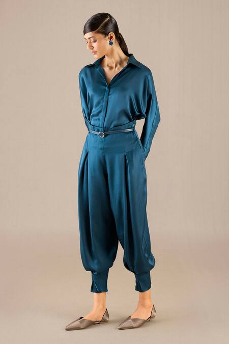 Teal shirt featuring a shirt collar and full sleeves, paired with box-pleated pants. The ensemble includes an enamelled belt for added style.