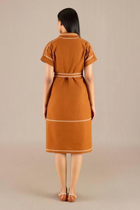 Tan brown shirt dress featuring mini striped borders and a collar neck. Comes with a matching belt for a cinched waist look.