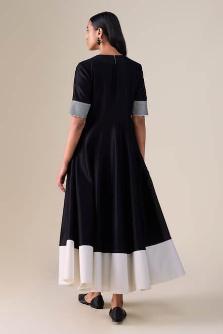 A black Chanderi kurta featuring a round neckline, short sleeves with striped cuffs, and an ivory panel at the hem, embellished with a delicate enamel brooch. It is paired with coordinating pants and a striped dupatta.