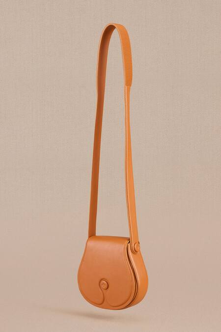 Tan faux leather crossbody bag featuring a structured shape and button closure