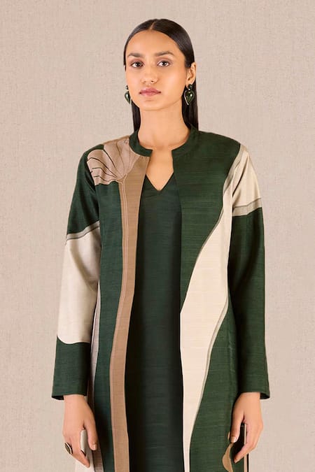 Dark green long jacket featuring colour-blocked floral patterns. Paired with a plain inner tunic and pant.